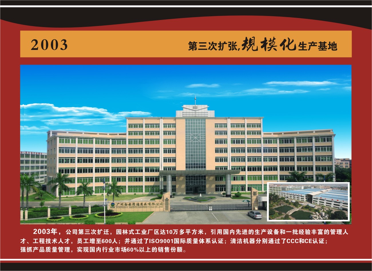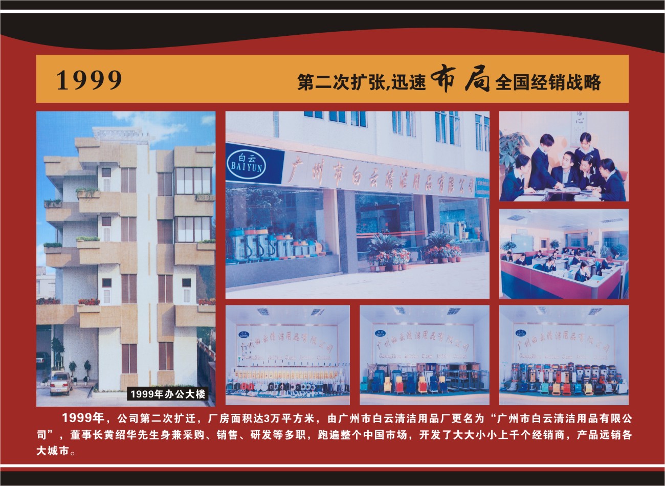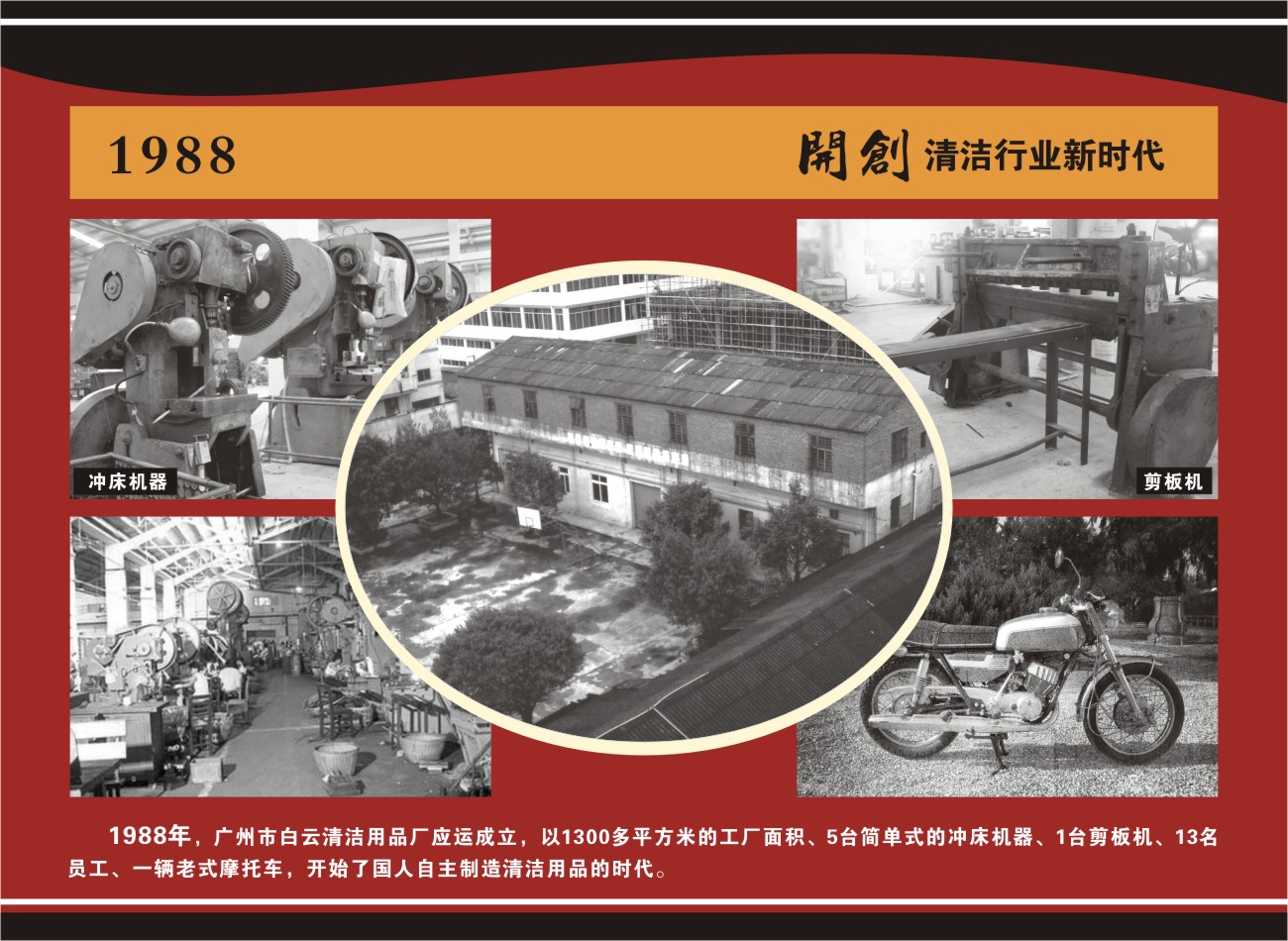 1988年,廣州市白云清潔用品廠應(yīng)運成立了,5臺沖床、1臺剪板機和13個員工,開始了黃紹華先生的創(chuàng)業(yè)夢想,也開啟了國人自主制造清潔用品的時代。當時清潔用品的概念在國人的腦海里極其模糊,特殊的歷史文化背景注定了這個行業(yè)在國內(nèi)起步的艱辛和緩慢。一顆執(zhí)著的心,憑著堅定的意志,促進了這個新型產(chǎn)業(yè)在國內(nèi)悄悄萌芽,并終于成長為一棵清潔用品王國的蒼天大樹。