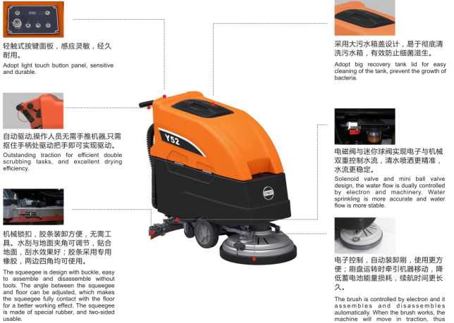 -刷盤:電子控制,自動裝卸刷,使用更方便;刷盤運轉時牽引機器移動,降低蓄電池能量損耗,續航時間更長久。